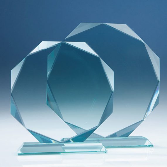 The sleek and stylish Octagon awards are crafted out of 15mm thick jade glass and are mounted on a rectangular base, as shown.
