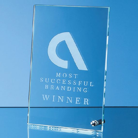 The stylish and versatile jade glass rectangle can be displayed vertically or horizontally with the aid of a chrome pin stand. There is a large area that can be printed or engraved with any crest, logo or wording to create an inexpensive recognition award or gift.