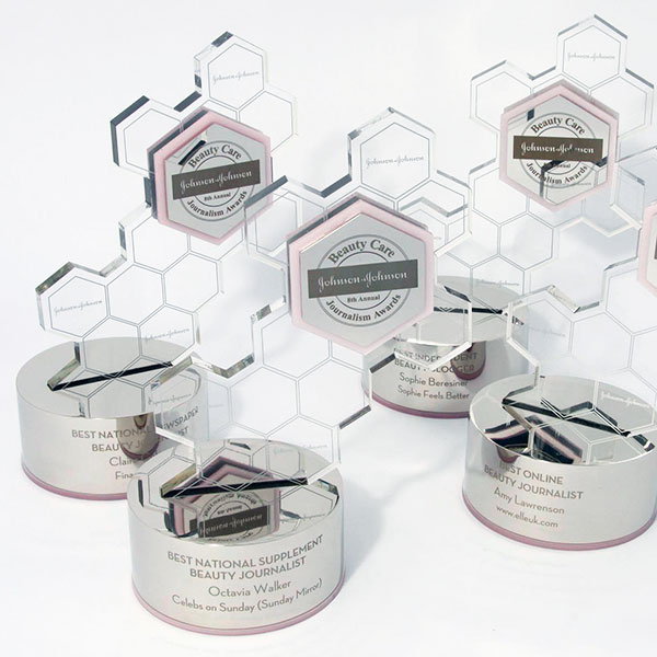 Polished nickel plated aluminium layered with clear and pearlescent acrylic to form an impressive bespoke award.