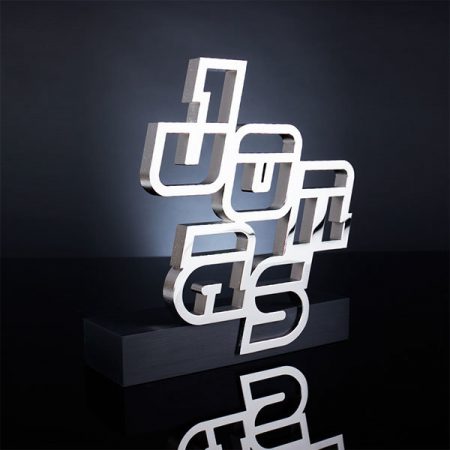 Eye-catching trophies made in solid aluminium and finished in polished nickel or gold plate, contrasted with an anodised texture and decorated with laser engraving.