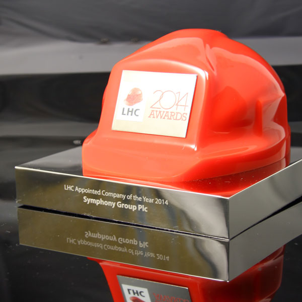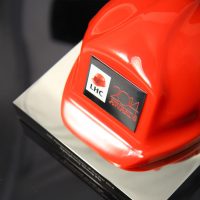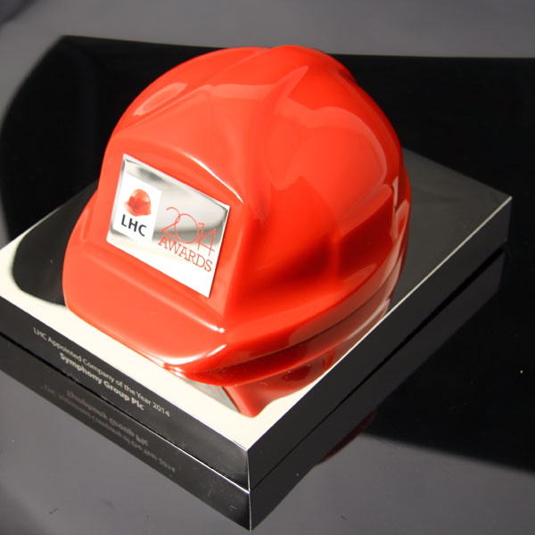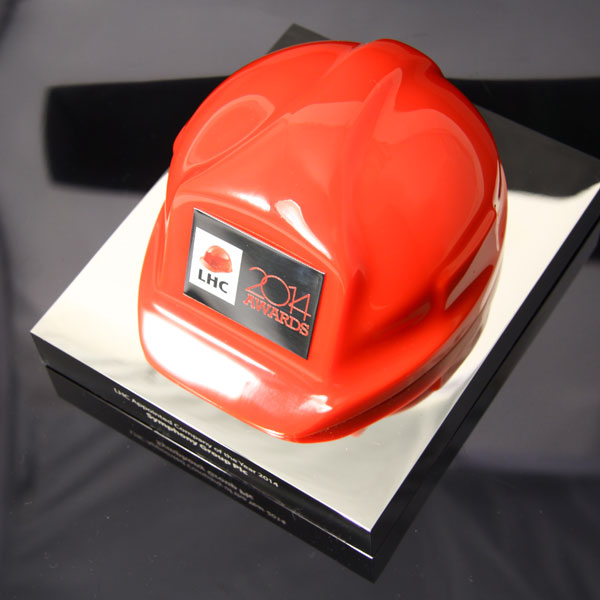 Cast acrylic hard hat combined with polished nickel plated aluminium to form an impressive bespoke award with a clear corporate identity.