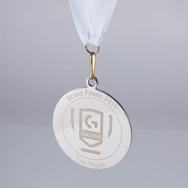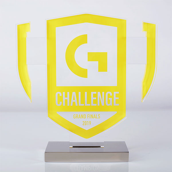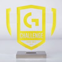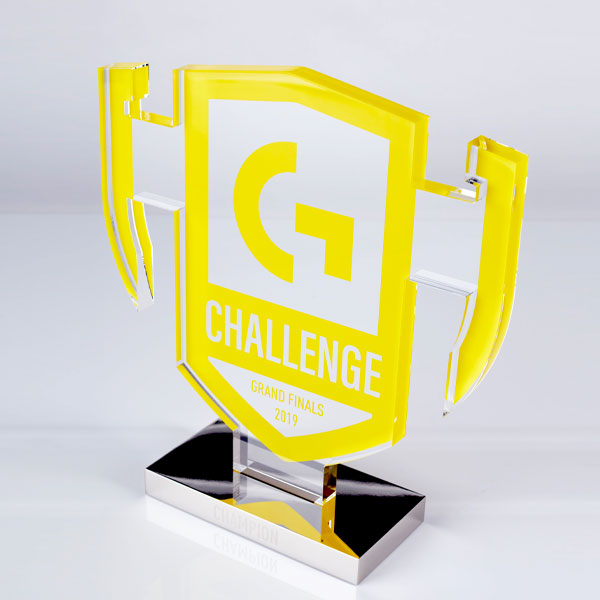Laser cut acrylic with a bold print, combined with a mirror finish aluminium base to form this eye-catching trophy.