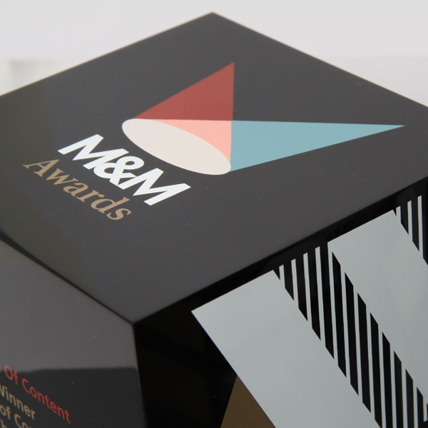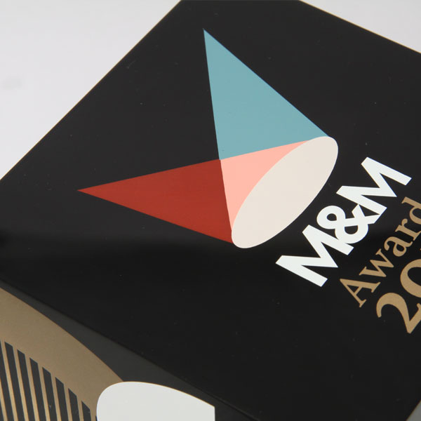 Striking cast black acrylic cube with logo and pattern detail printed to 4 sides.