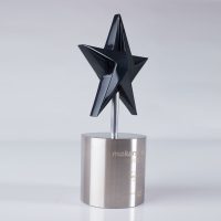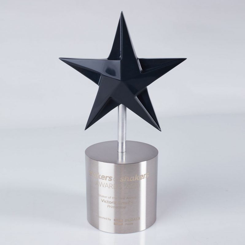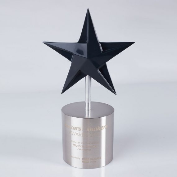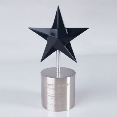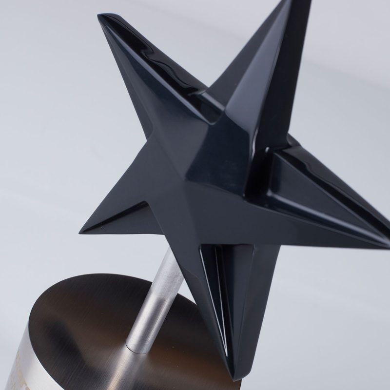 These trophies feature a colour-matched, three-dimensional star, mounted on a brushed nickel plated plinth, engraved with the winner’s details.
