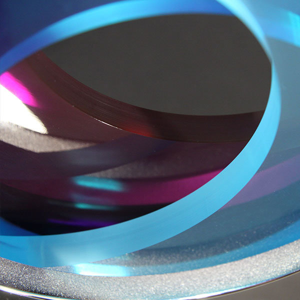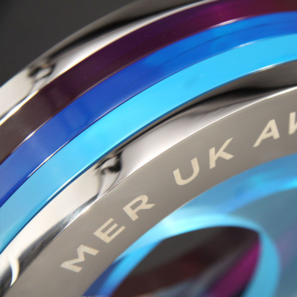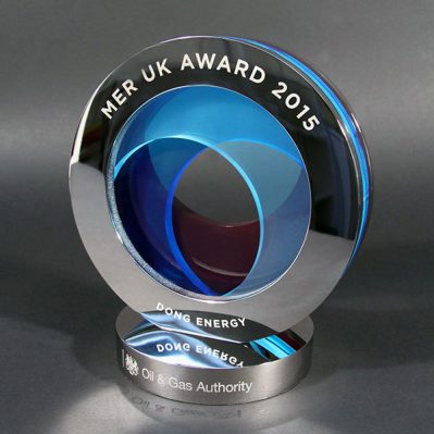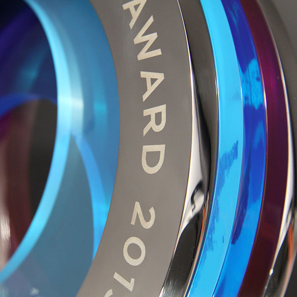 Stunning layered acrylic and polished aluminium award. Each coloured layer is pierced from translucent acrylic to form a beautiful 3D effect.