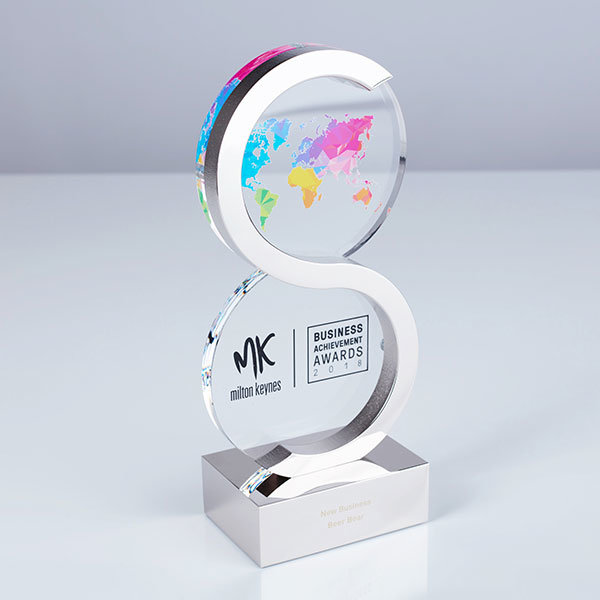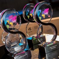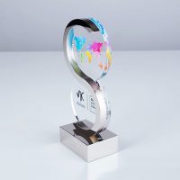 This trophy design reinforced the theme of the evening with a map of the world digitally printed in full colour on clear acrylic, positioned above the event’s branding and neatly encased in a contemporary styled S-frame. The plinths were laser engraved with the award categories and winner’s details.