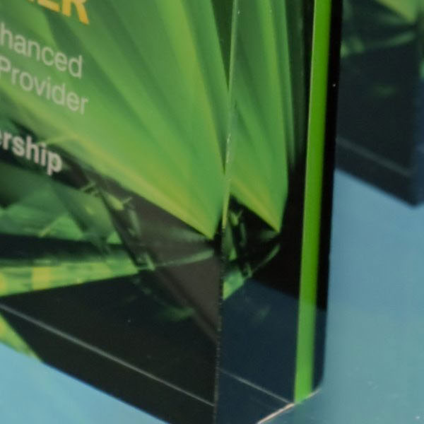 Stunning laminated acrylic award made with clear acrylic to the front, backed with vibrant acrylic layered to form an eye-catching trophy.