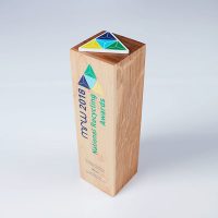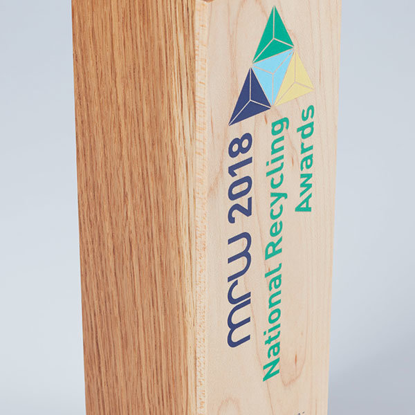 Striking Oak and Maple award with full colour printing and white acrylic badge.