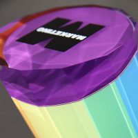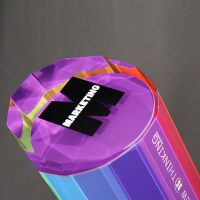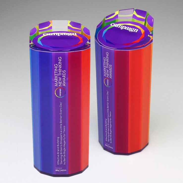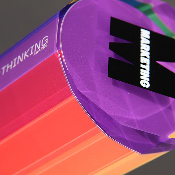 Stunning cast 12 sided acrylic award with internally encapsulated rainbow artwork and externally printed logo.