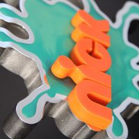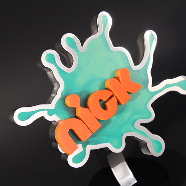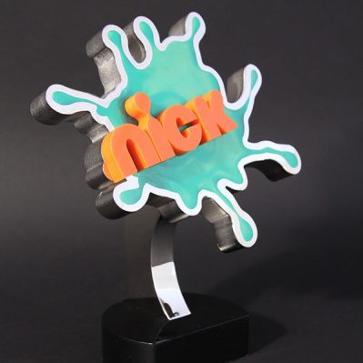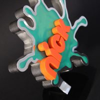 Eye-catching prestigious trophies, styled in the shape of a fun SPLAT and fabricated out of nickel plated aluminium and zany orange acrylic.