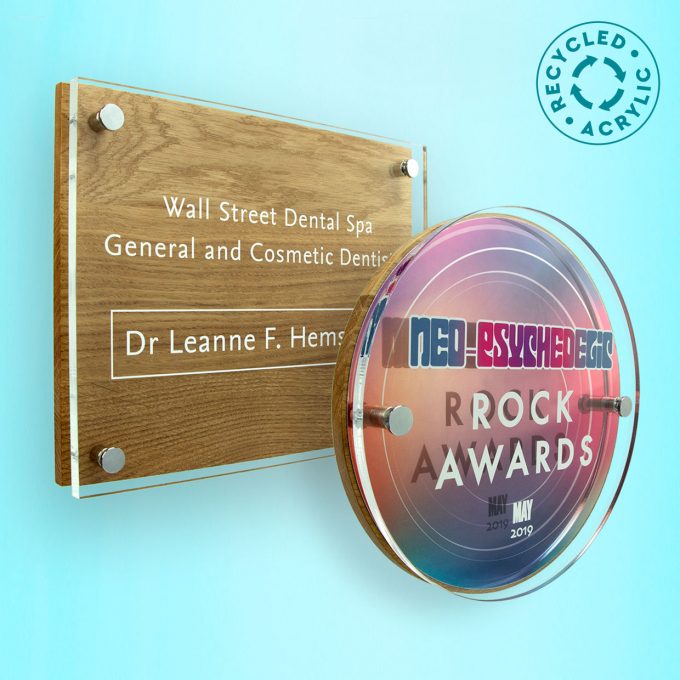 Oak plaque in a choice of two shapes: round and oblong with front panel in clear recycled acrylic . Responsibly sourced, individually unique and 100% recyclable.