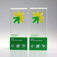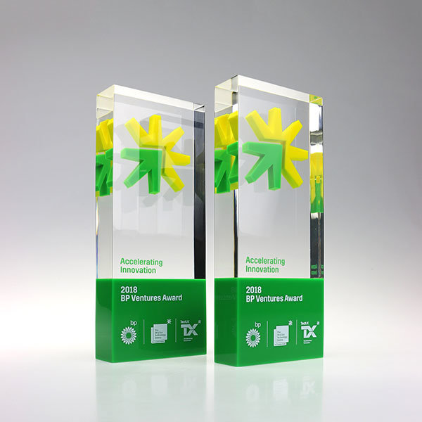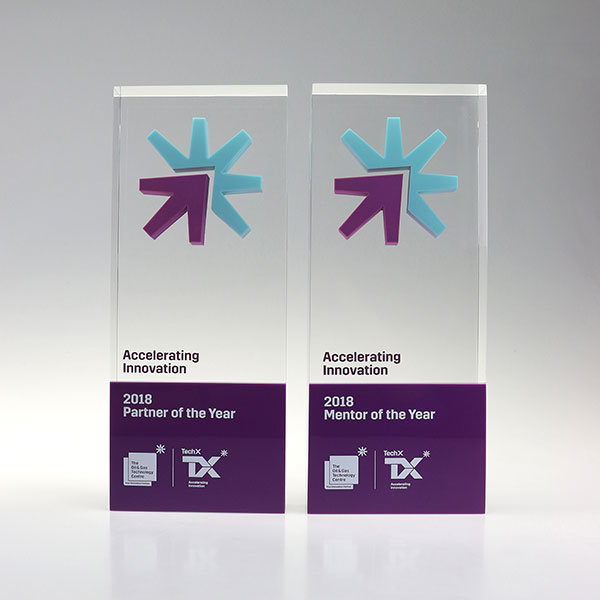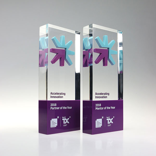 Striking cast acrylic trophy with colourful encapsulated symbols. Text and sponsor logos are externally printed.