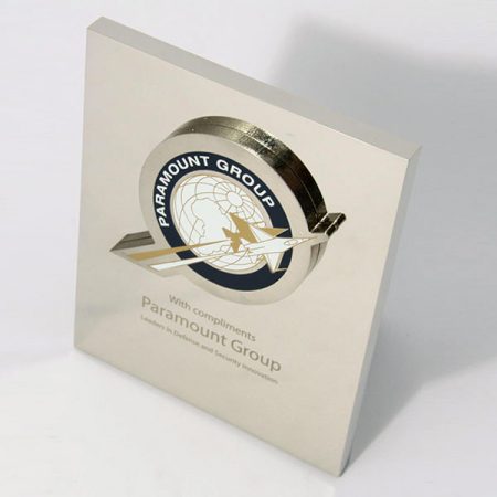 Eye-catching wall plaque made from polished nickel plated aluminium layers with bold printed detail and invisible wall fixings.