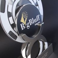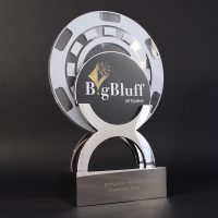 Standing a magnificent 40 cm tall and featuring a stylised poker chip in polished nickel plate and crowned with the Big Bluff branding printed on clear acrylic, the trophy certainly made the right impression.