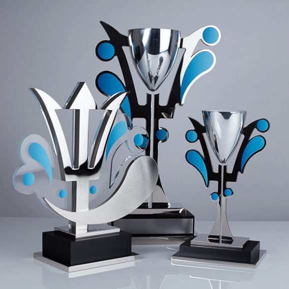 This striking collection combines finely-spun cups, plus precision-engineered aluminium trophies and digitally printed medals.