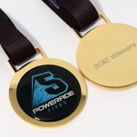 Made from polished gold or nickel plated aluminium with bespoke branded ribbon.