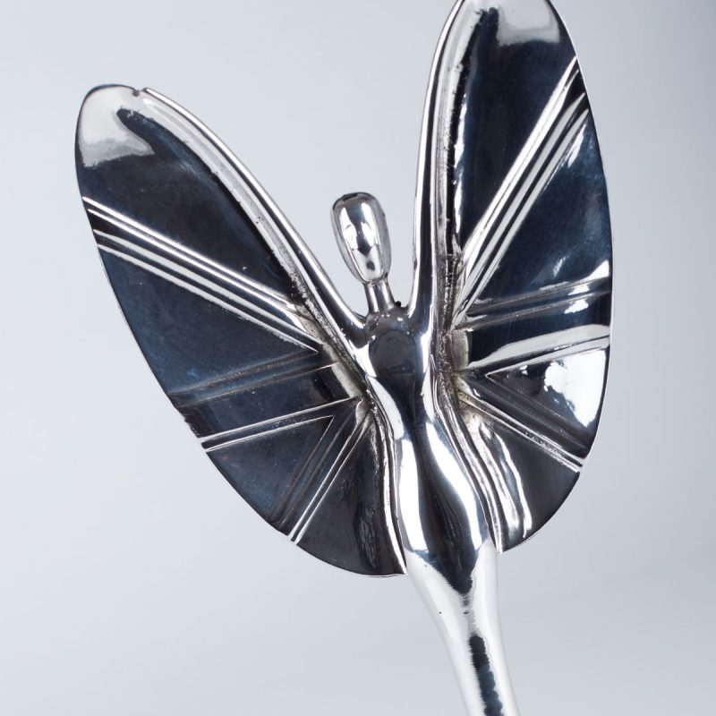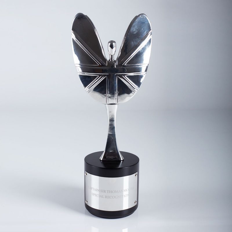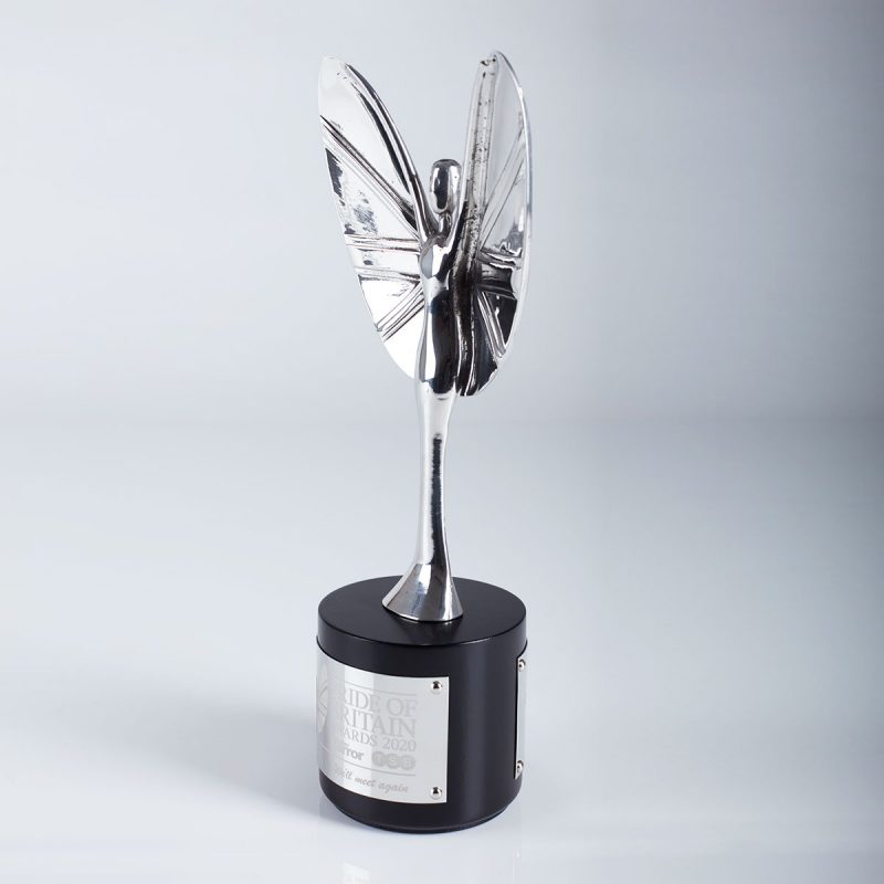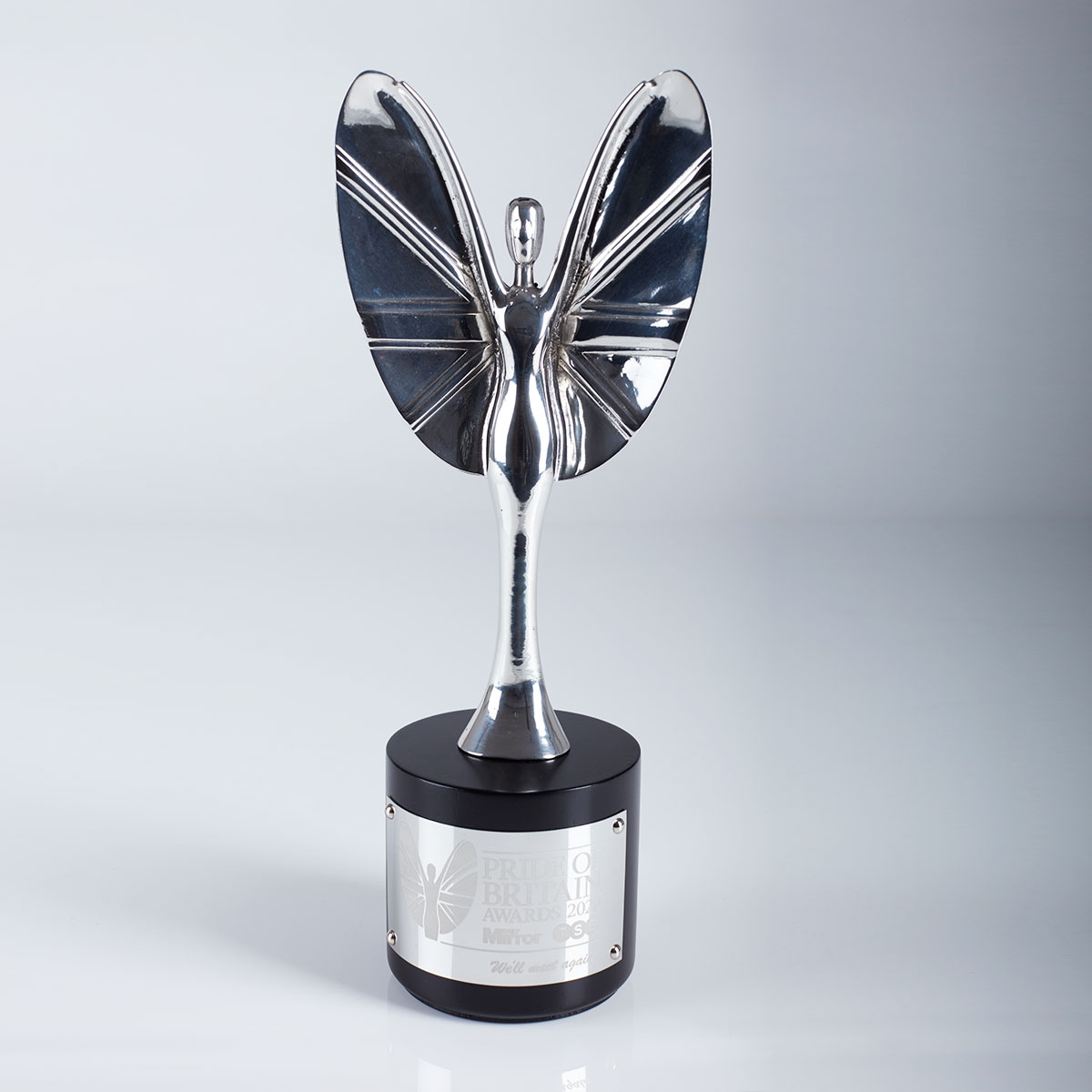 Iconic and recognisable winged figurine. The striking Pride of Britain logo is realised in 3D solid pewter in a high shine finish with a black resin base and pewter plaque for the all-important winner’s name. The weighty figurine design is so popular to give the award the ‘thud’ factor, that wonderful feeling the receiver gets when they feel their worth in weight.