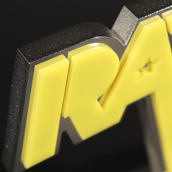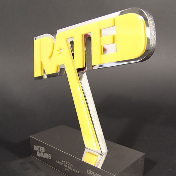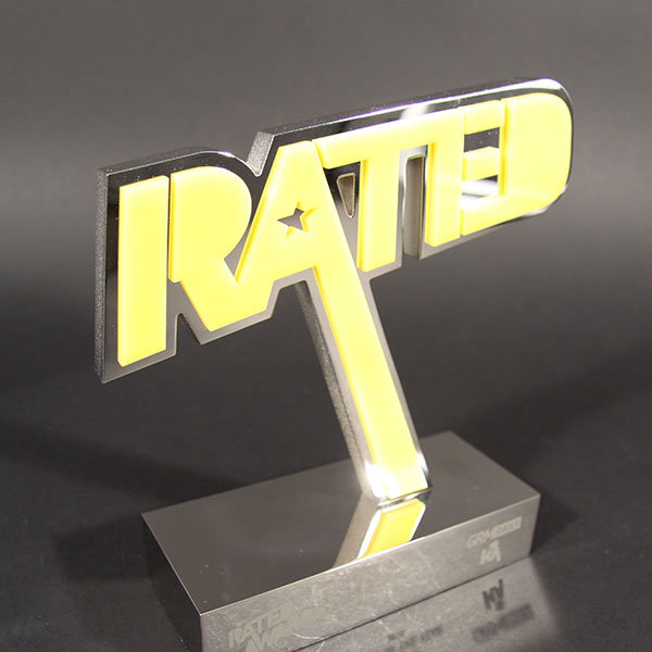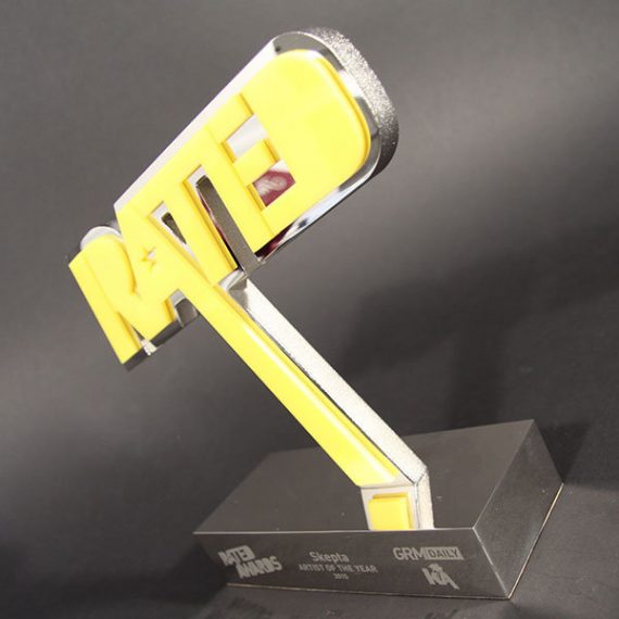 Polished nickel plated aluminium combined with precision laser cut yellow acrylic to form an impressive bespoke award.