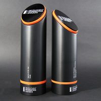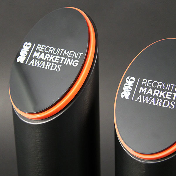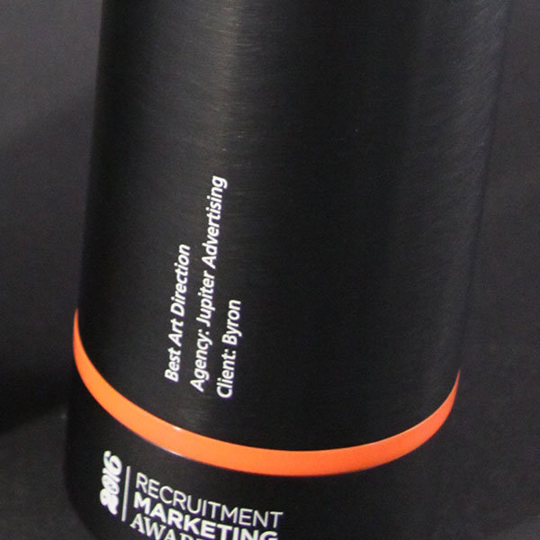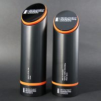 Imposing black anodised aluminium cylinder with orange acrylic detailing and laser engraved logo and winner text.