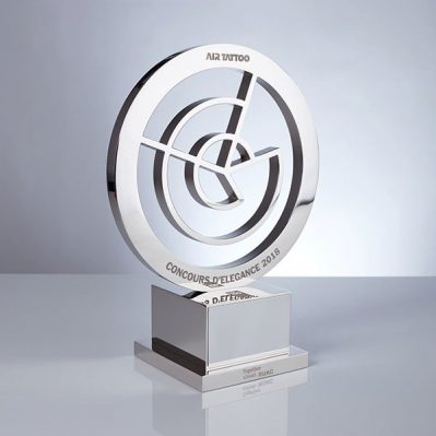 Collection of three stunning trophies in polished nickel plated aluminium with bold acrylic detailing.