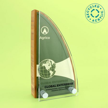 Wave trophies in a choice of four sizes and three mellow woods: oak, cherry and bamboo with front panel in mirror-finished metal and recycled acrylic. Responsibly sourced, individually unique and 100% recyclable.