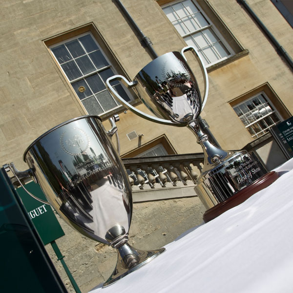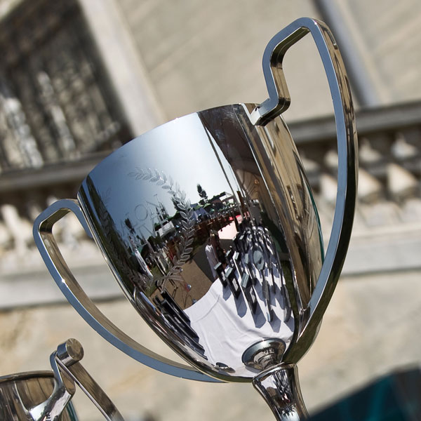 Stunning silver plated cup with diamond engraved logo and wreath detail.