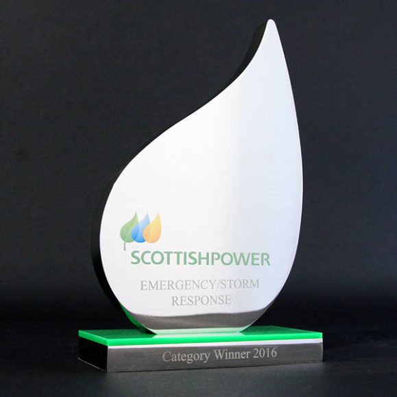 Distinctive profiled polished aluminium award with full colour printed logo and vibrant green acrylic.