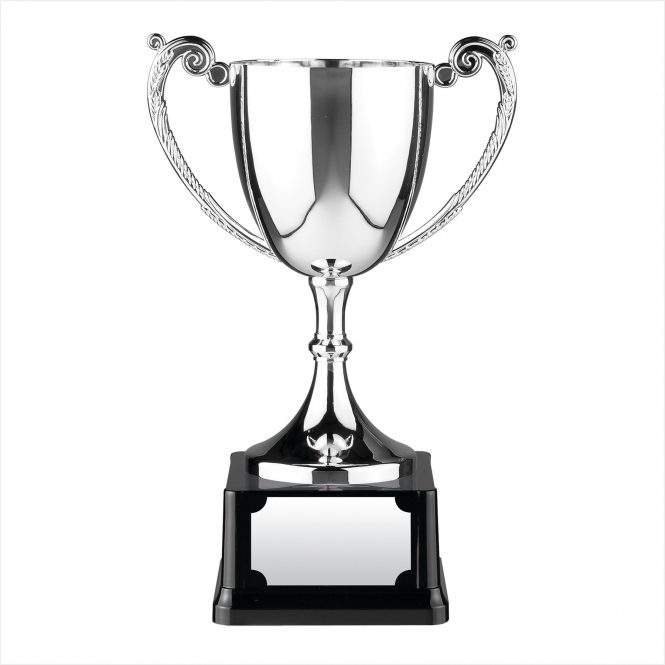 Nickel plated cup with traditional handles and heavy weight square black plinth.