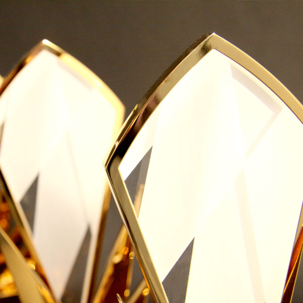 Layered polished gold plated aluminium combined with etched clear acrylic to form an impressive bespoke award.