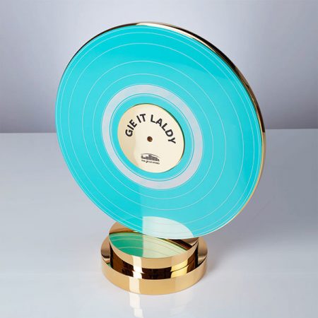 This eye-catching ‘record’ award makes use of full colour printed laser cut acrylic with polished gold plated aluminium, to great effect.