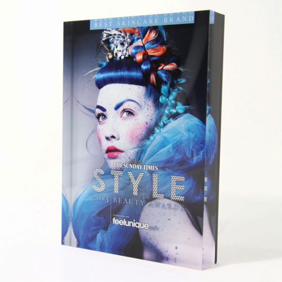 Layered acrylic tablet with bold, eye-catching, colour print and acrylic backing.