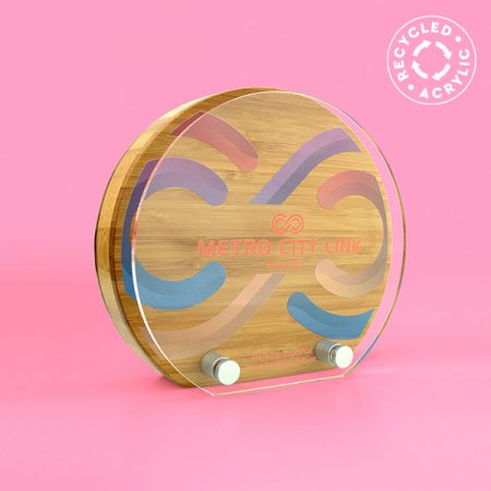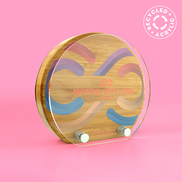 Sunrise trophies in a choice of three sizes and three mellow woods: oak, cherry and bamboo with front panel in clear recycled acrylic. Responsibly sourced, individually unique and 100% recyclable.