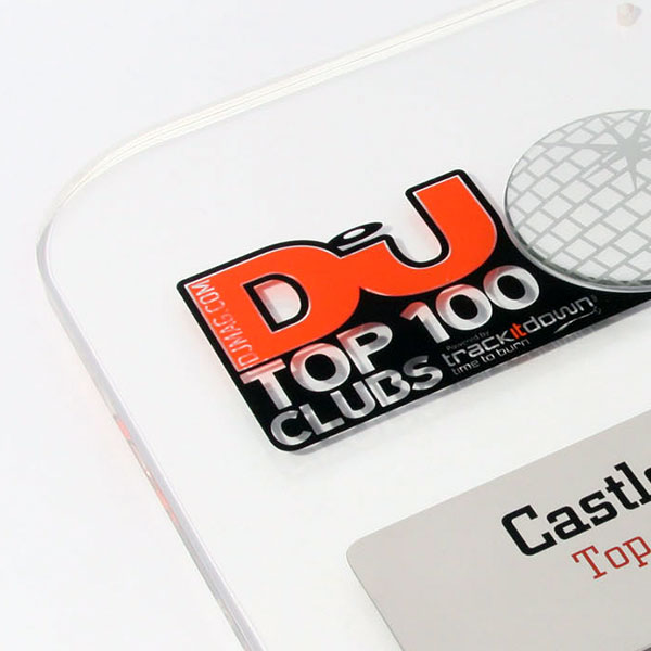 Laser cut acrylic plaque with polydome printed glitter ball and full colour printed logo.