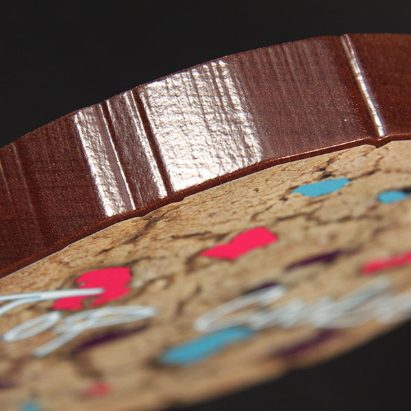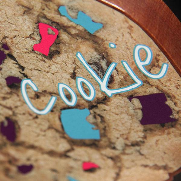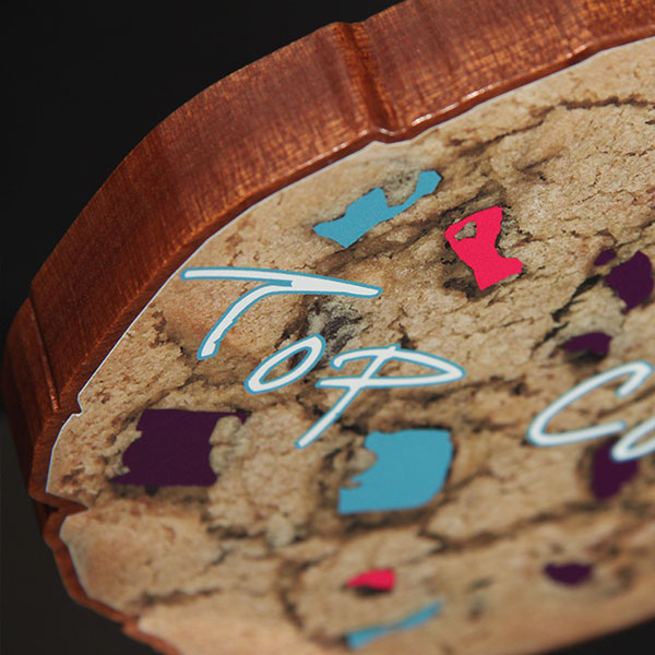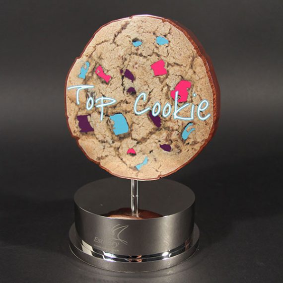 Yummy Cookie award featuring a waterjet cut natural wood top with prominent full colour print.