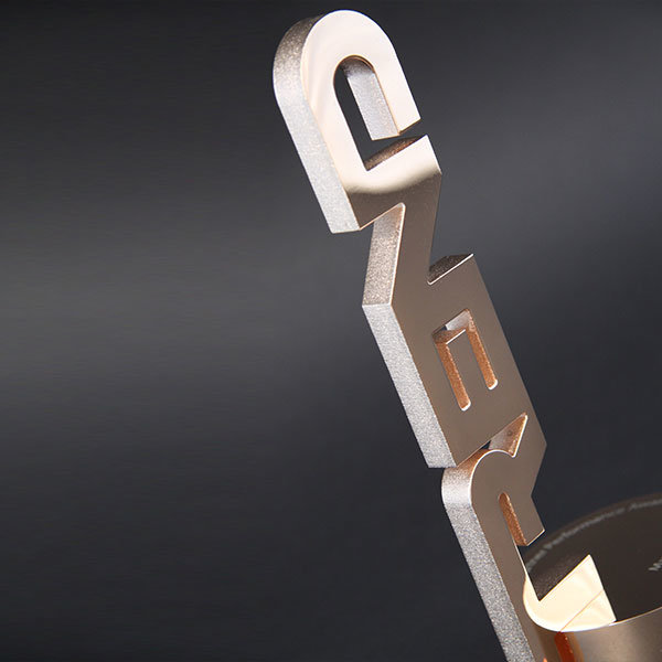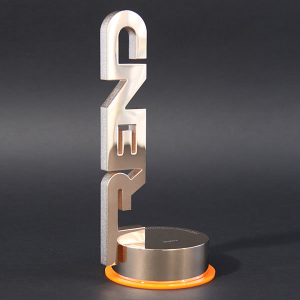 Stunning rose gold plated aluminium award intricately pierced with the event logo and fixed to a cylindrical base with orange acrylic plinth.