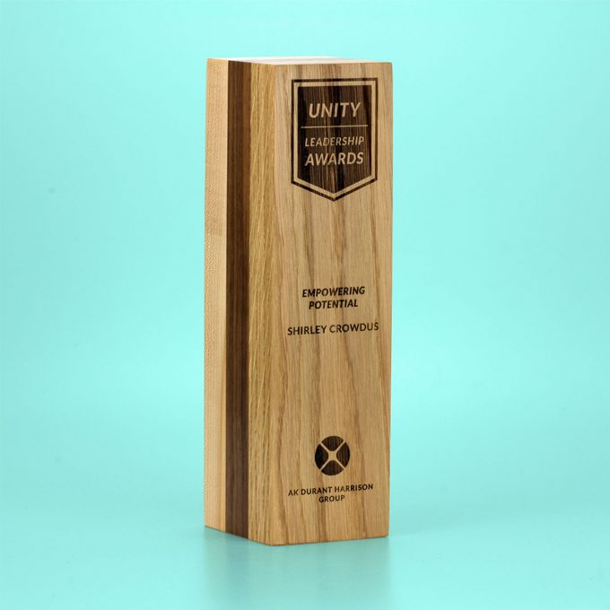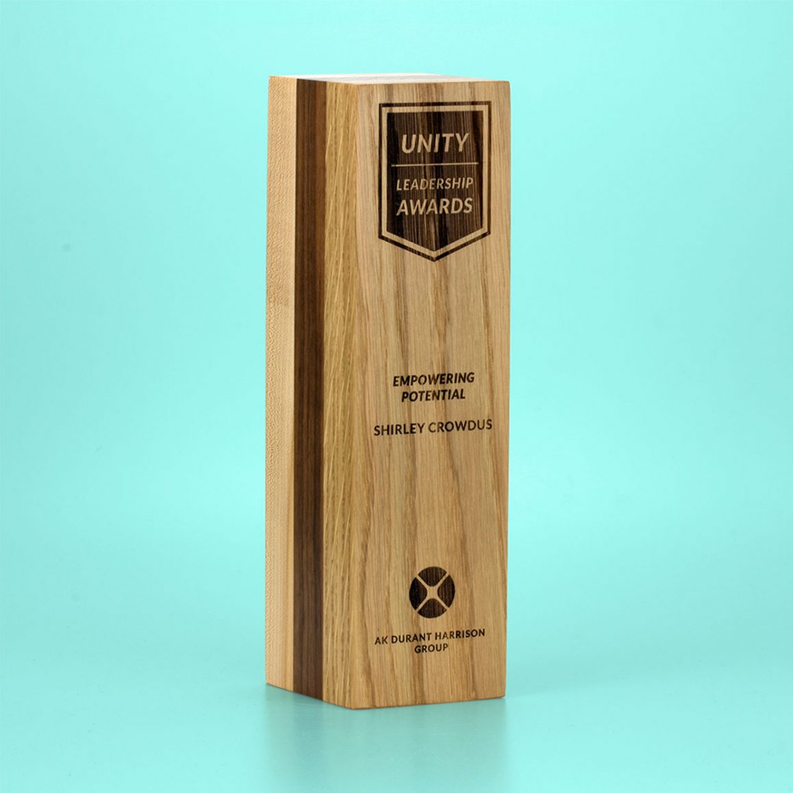 Triple layer column trophy with Oak, walnut and maple bonded layers. Responsibly sourced, individually unique and 100% recyclable.