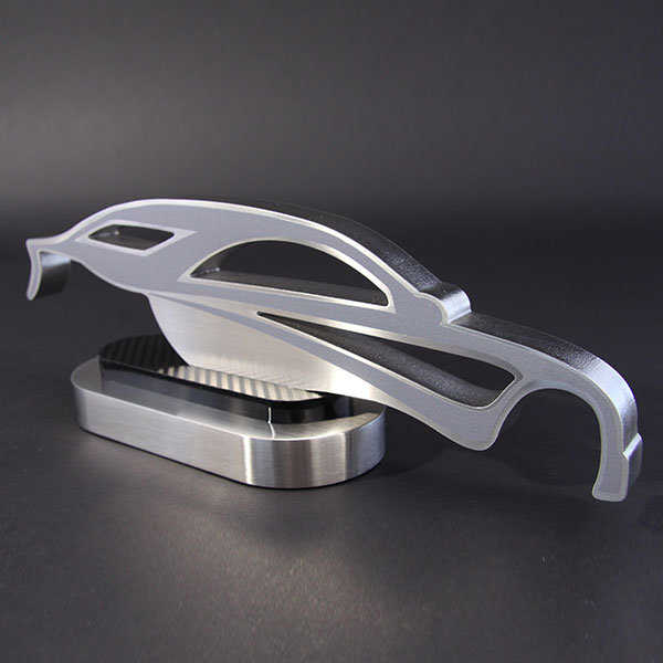 These trophies feature a futuristic car frame design and are manufactured from aluminium, finished in a brushed steel effect and printed trim. The engraved plinth is an integral element of the trophy design and features a carbon fibre effect surface, skilfully achieved in acrylic.