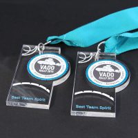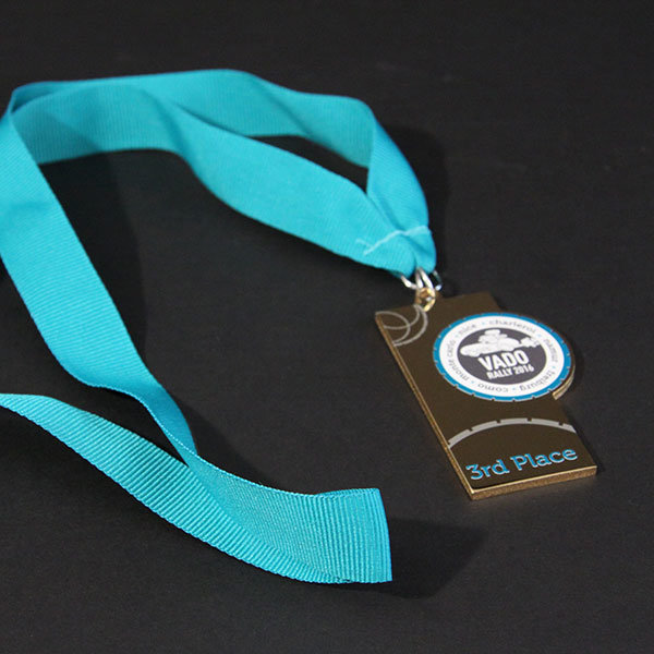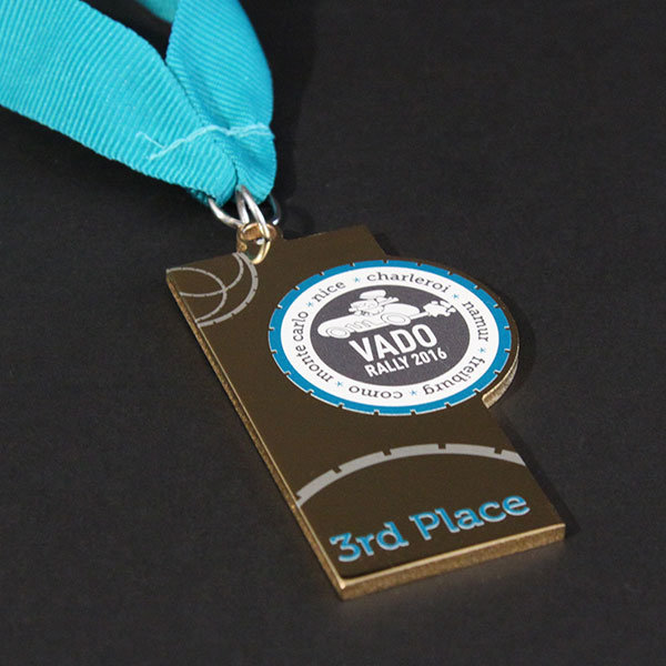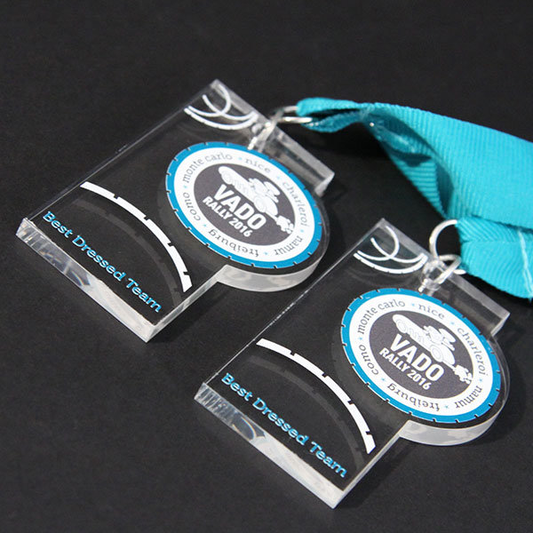 Profiled medals in clear acrylic and gold plated aluminium with a bold full colour print and bespoke ribbons.
