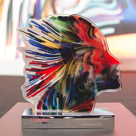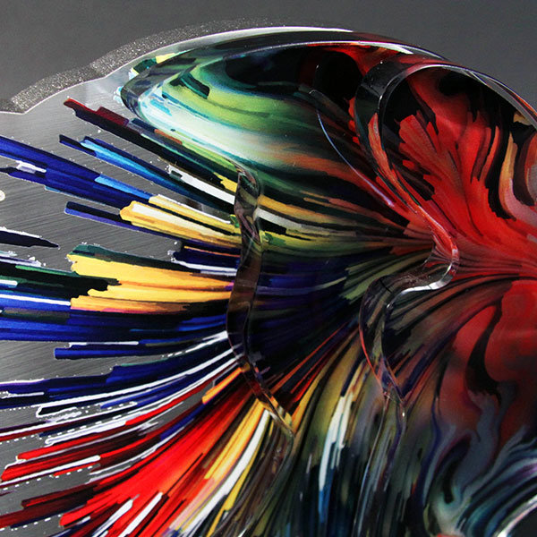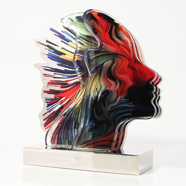 Standing almost 23 centimetres tall, the stylised head comprises two stepped layers of flame-polished glass, each digitally printed in colour on the reverse. These are mounted on a third layer of brushed nickel-plated aluminium, which is likewise digitally printed, whilst the reverse and podium are laser engraved. The combined artistic effect creates an intensity and wonderful sense of motion to each piece.