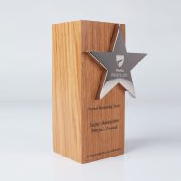 Solid wood column award with glesaming nickel plated star and laser engraved winner detail.