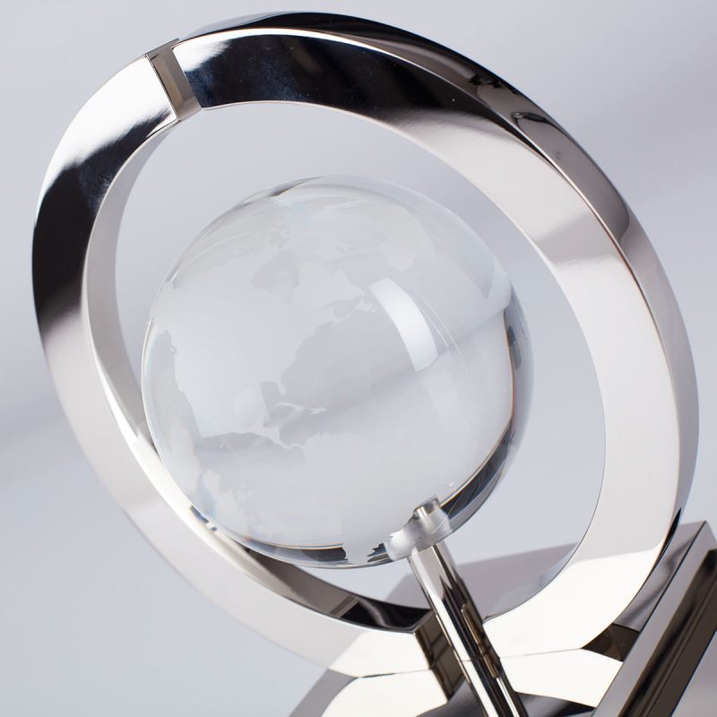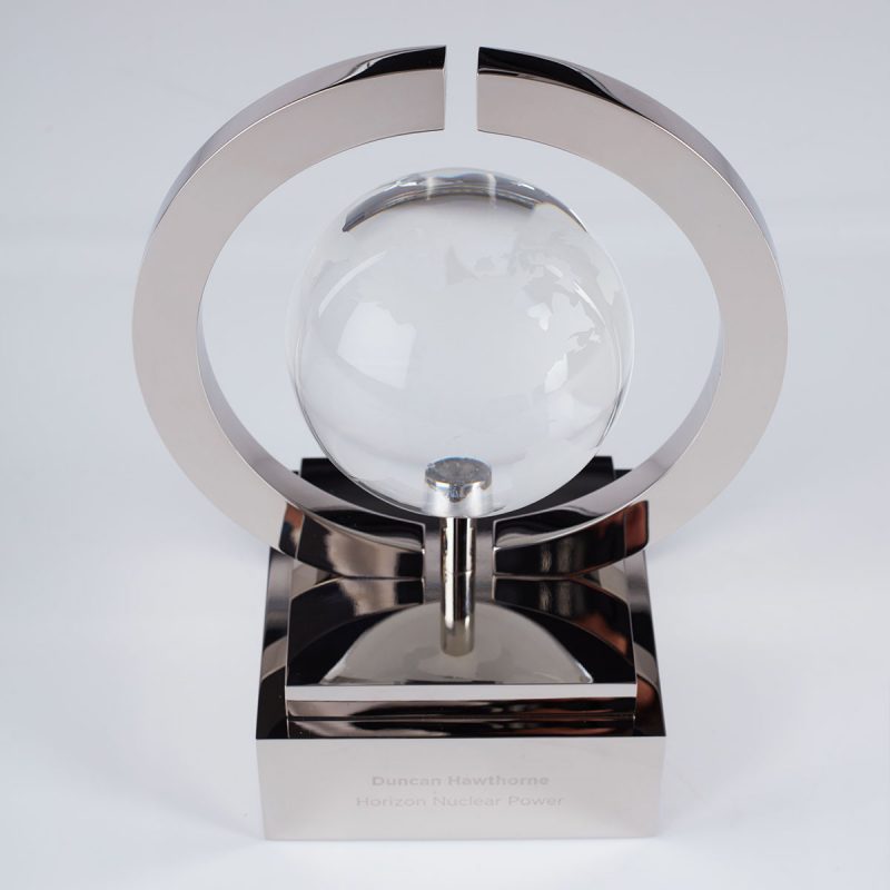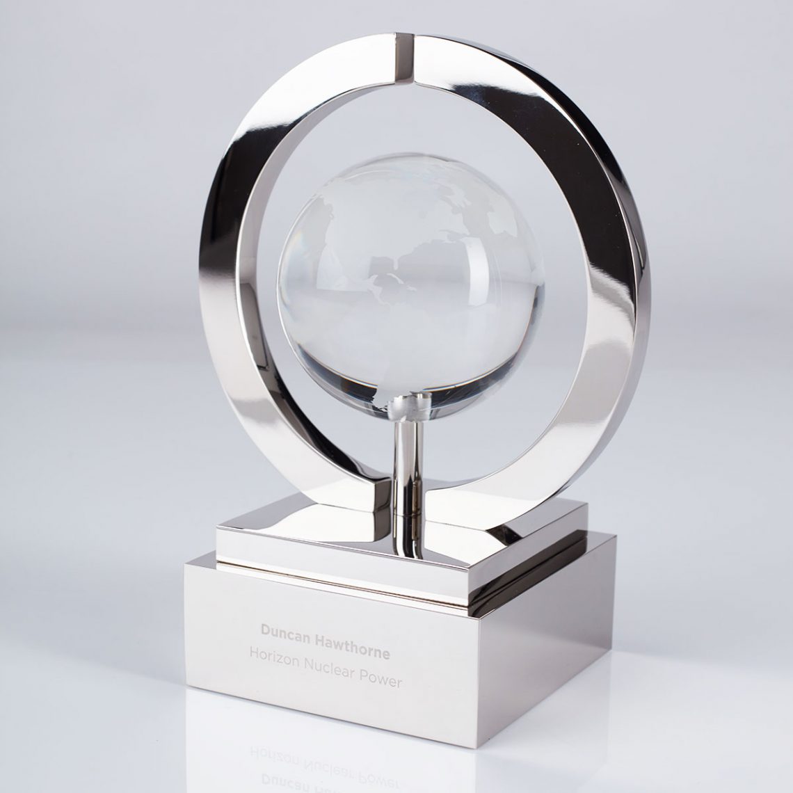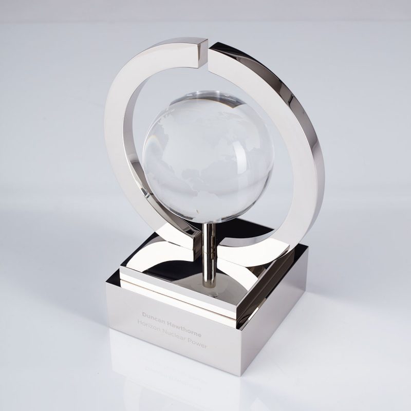 Stunning polished nickel plated aluminium award with an acrylic globe suspended within.