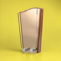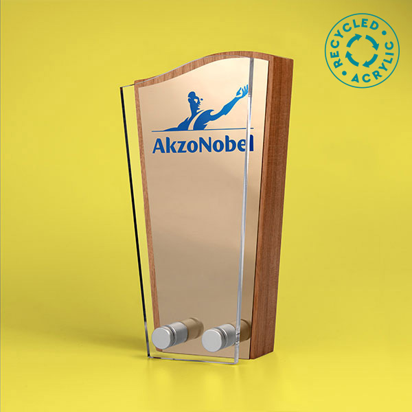 Wave trophies in a choice of four sizes and two mellow woods: oak and cherry with front panel in mirror-finished metal and recycled acrylic. Responsibly sourced, individually unique and 100% recyclable.