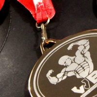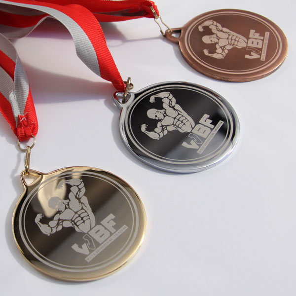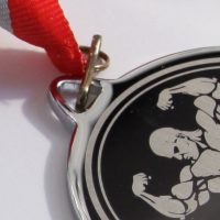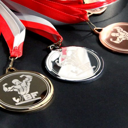 These gold, silver and bronze plated medals depict a female and male form of a powerful body builder and come complete with red and white ribbon.