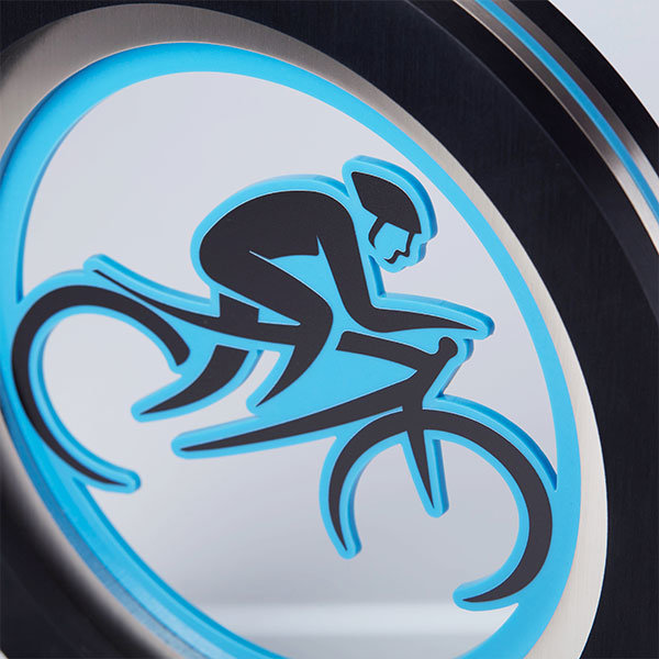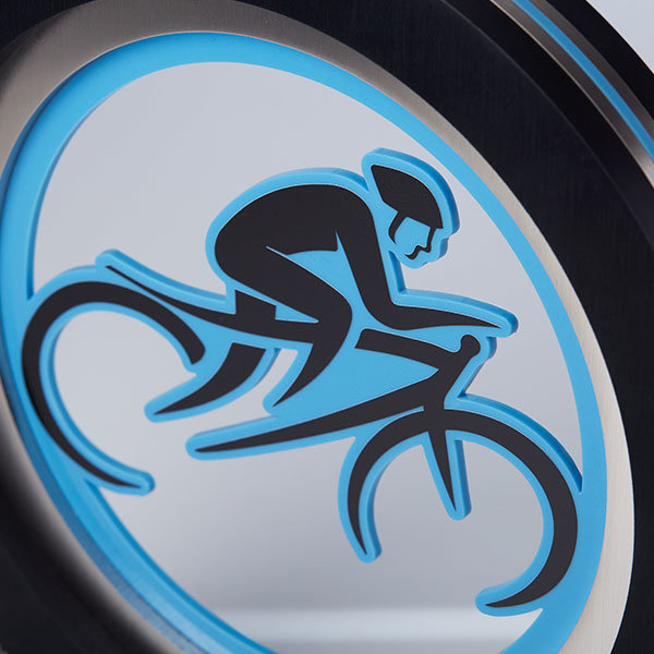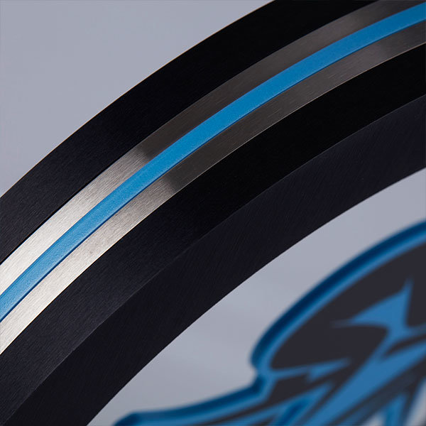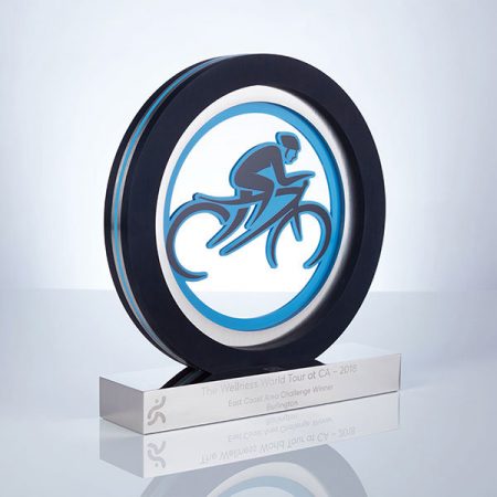 Dynamic sporting award with layers of black anodised, brushed aluminium and coloured acrylic.