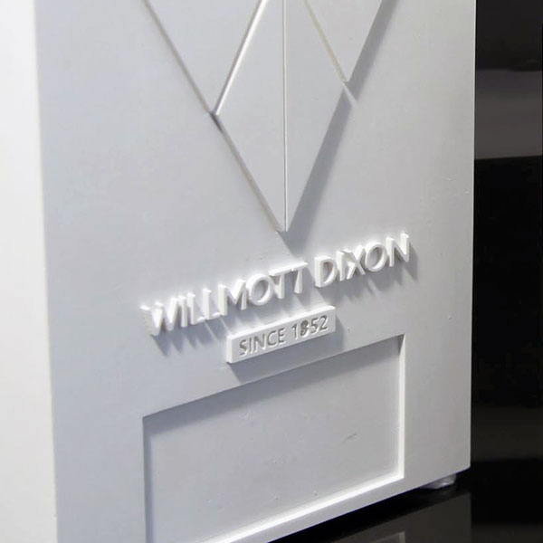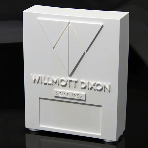Striking composite stone block with prominent embossed logo detail and recessed plate.