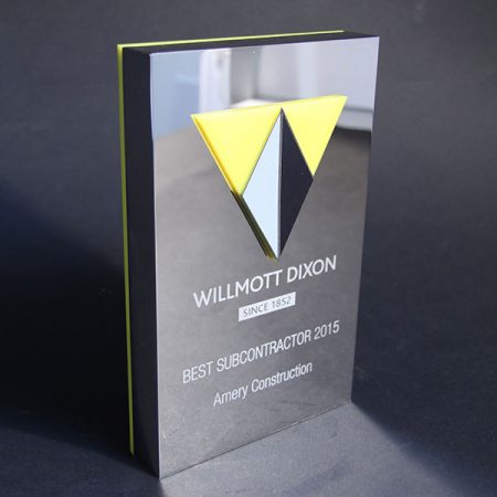 Imposing polished nickel plated aluminium trophy featuring a pattern of laser cut acrylic triangles. Yellow acrylic backing adds the finishing touch.