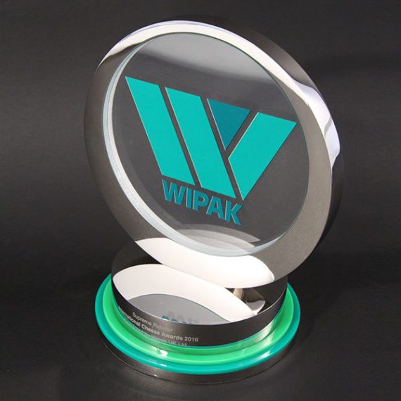gleaming polished aluminium combined with vibrant acrylic and print to form this eye-catching award.