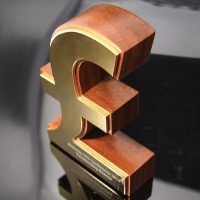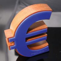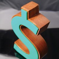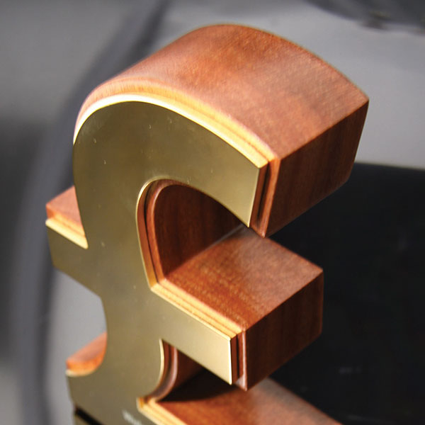 Profiled wood currency symbols with either polished gold plated aluminium or coloured acrylic fascias.