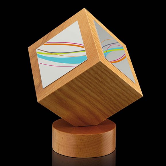 Distinctive award featuring a natural wood cube fixed on it’s point to a round wood base. Full colour printed plates are applied to three sides of the cube.