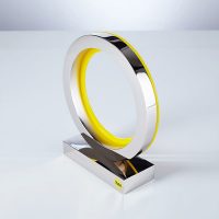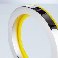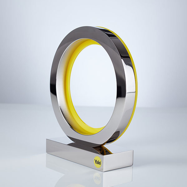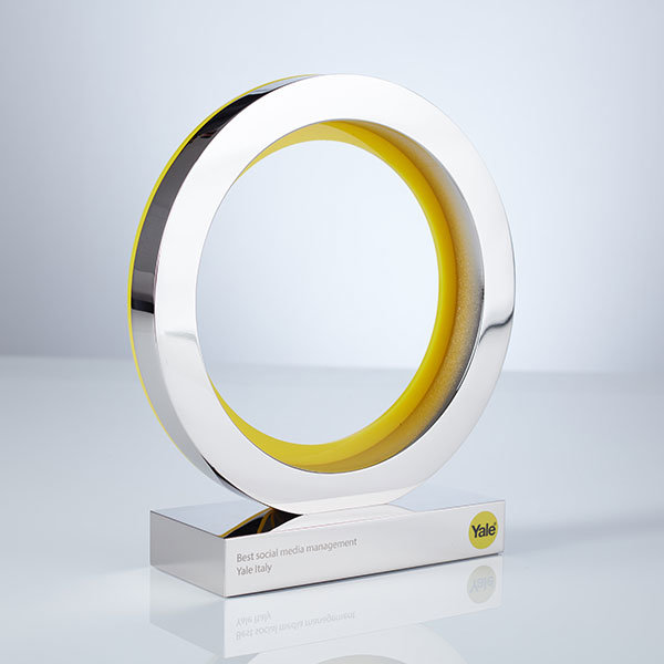 Beautifully simple polished aluminium award with vibrant yellow acrylic ring detail.
